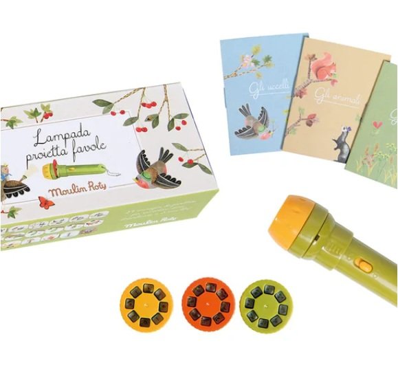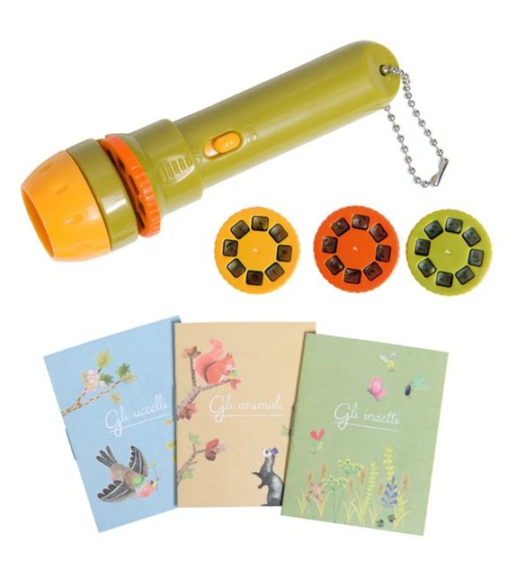 Torcia dove ognuno dei dischi proiettati sulla parete racconta una storia a colori senza parole sul tema delle favole ad ombre. Un momento magico per sviluppare la fantasia e l’immaginazione dei bambini.