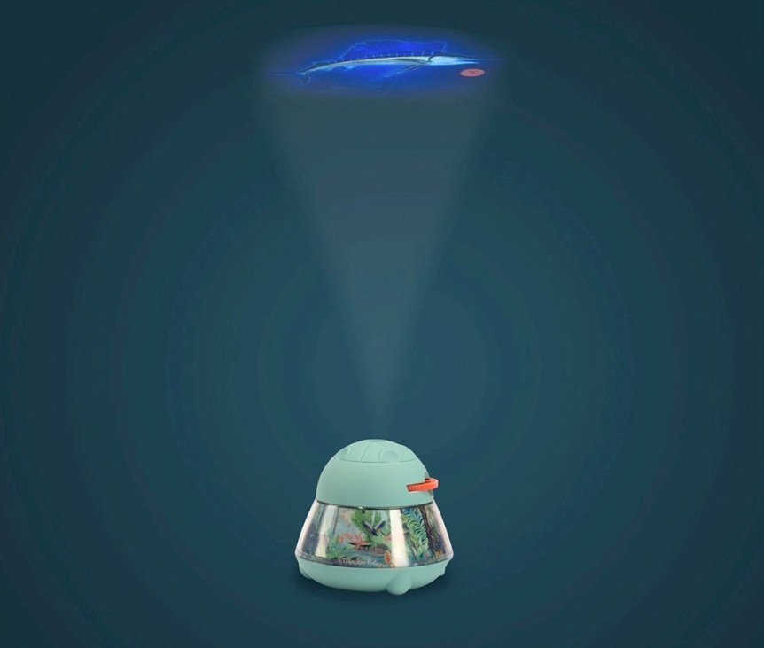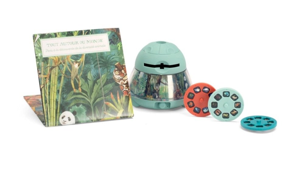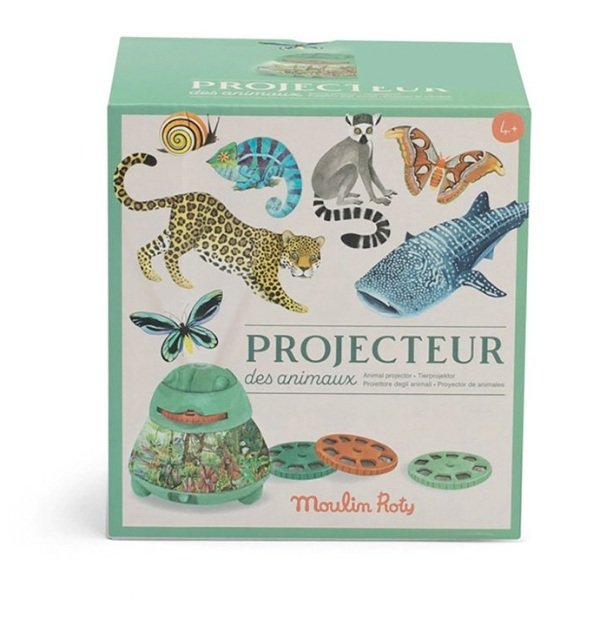 Il proiettore da tavolo di Moulin Roty ha 24 immagini di animali e del loro ambiente che vengono proiettate sul soffitto per stimolare l’immaginazione dei bambini.