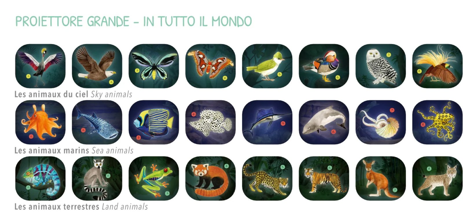 -Include: 1 proiettore con luce integrata, 3 dischi con 8 immagini ciascuno, 1 poster con le immagini e i nomi di alcuni animali in francese